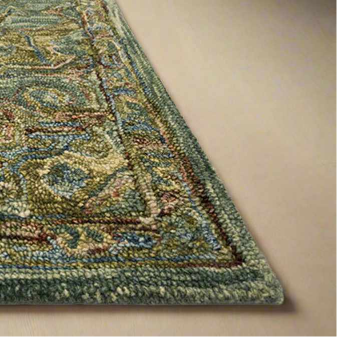 This rug is stunning and crafted using the technique of Rug Hooking, where loops of yarn or fabric are pulled through a stiff woven base of burlap, linen, or rug warp. With a pile height of 0.75" and a backing of cotton canvas, this rug combines traditional patterns, delicate textures, and muted tones. Made of 100% wool and featuring a finely hooked design, it also has a unique looped texture for added dimension. Colours are described as dark green/tobacco and whiskey.