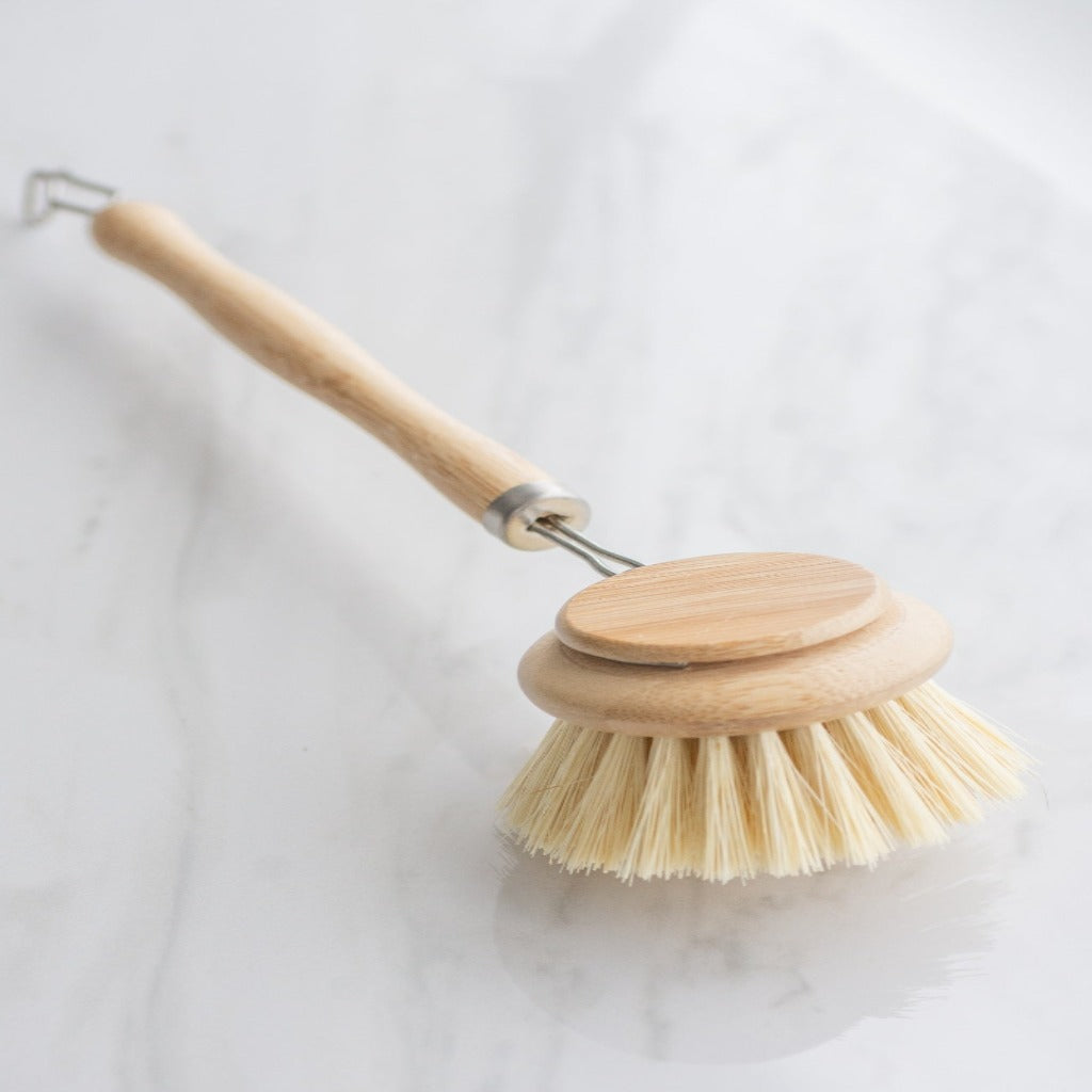 Sustainable dish brush swap helps you replace plastic dish brushes in the kitchen! This removable-head dish brush has a Moso Bamboo handle and brush head, with stiff agave fiber (vegan) plant bristles. It is held together with silver metal wire and includes a small wire loop at the end for hanging dry.