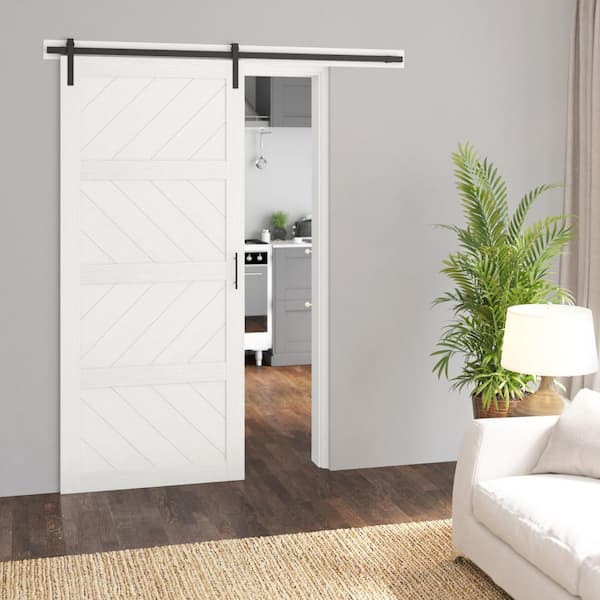 Create a charming, modern farmhouse look in any room with this 84"x36" Sliding Barn Door. Featuring a sleek chevron design, this door comes with all hardware needed for the set up and easy installation. Use it to save space or upgrade the style of your home or office.